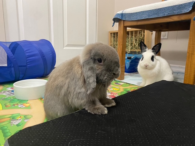 Twix (brown lop male) and Cookie (black and white spotted female Netherland dwarf) were found abandoned outside an animal shelter. There was no room at the inn, but thanks to one of our kind foster families they were taken in. They are three and a half to four years old and are extremely sweet mellow rabbits.