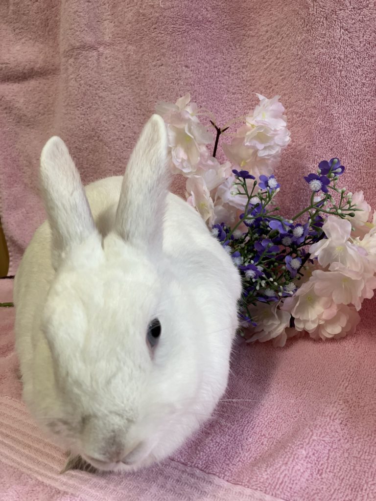 Emily is a dwarf cross, female, white with blue eyes. She is a shy bunny who has been with us for almost 5 years. She has never been in a home.