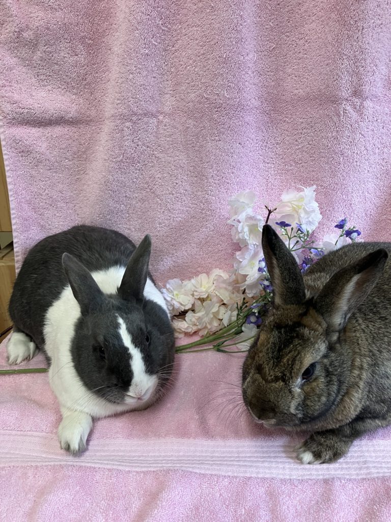 This pair have been together their whole lives. Both were picked up as babies in a Richmond park. Charlotte is a grey and white Dutch with blue eyes. Branwell is a brown bunny with some white toes. Both are shy rabbits, especially Branwell. They are medium small rabbits.