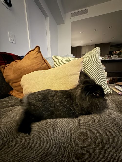 Mike and I adore Meribeth. She is such a special bun. Curious, very smart, cheeky, and so cuddly. Her favourite is to lay next to you nose to nose, and, if you stop pets, she’ll give you a strong boop in your face. She’s so funny and has brought a lot of joy into our home. Those that passed her by really missed out. We won the bunny lottery!