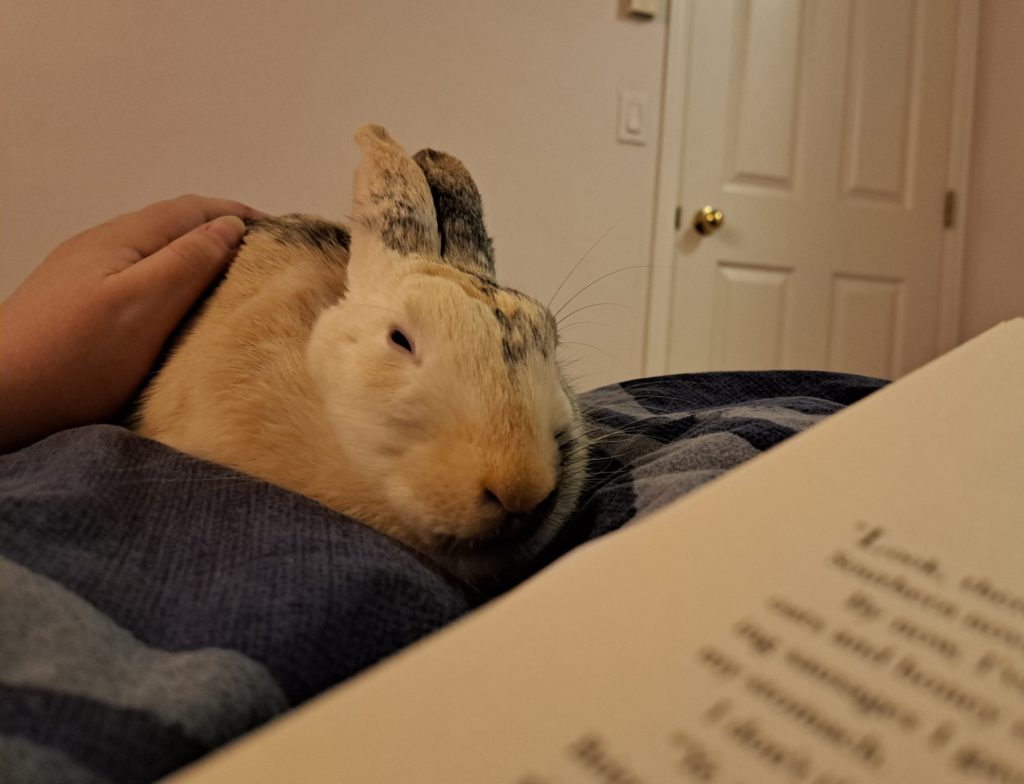 VRRA brought Sandy to a bunny social at a local park, and he was the star of the day! He was outgoing right from the start, binking and zooming around all day long. Sandy was good with all the young children, the noise, and even puppy passersby. He was eager to make new human friends, snuggling up and flopping right beside his new buddies.