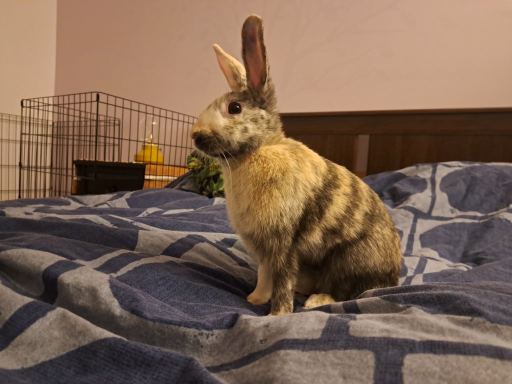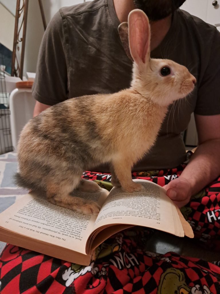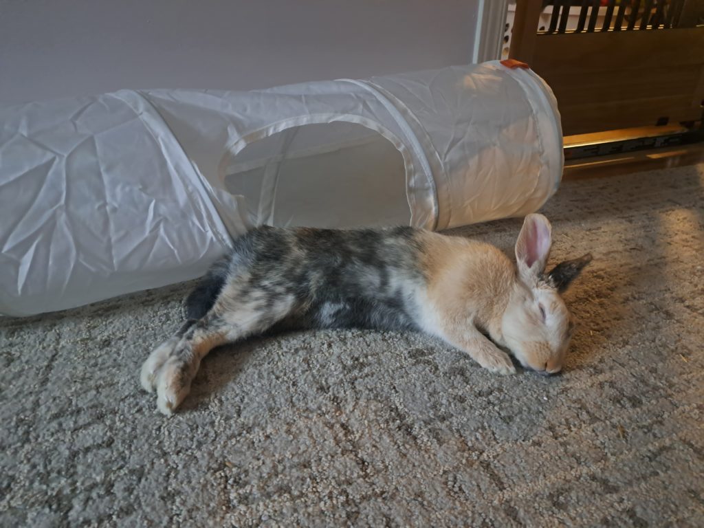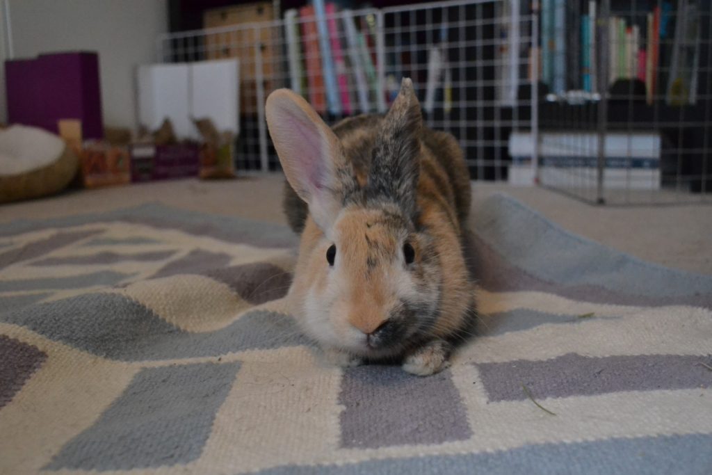Whether you’re looking for entertaining binkies or lots of sweet snuggle time, Tiger Lily could be the perfect bunny for you! She loves to play, run and explore, but will happily flop down next to you for a nice, long rest or cuddle up with you while you’re reading or watching TV. Though she takes a minute to warm up to new people, and doesn’t love to be picked up, she absolutely thrives on attention and loves to be pet. She will even groom you to say thank you! She is 95% good with chewing only what she is allowed to, and as long as you give her lots of enrichment activities and bunny-safe sticks, she is happy to chew on those. Your cords will need to be blocked off or protected, as they are the most tempting. Tiger Lily has excellent litterbox skills, but doesn’t always appreciate having her area tidied while she is in it. She has a love-hate relationship with the broom and will usually try to persuade you to stop sweeping. For this reason, a home with some bunny knowledge and no young kids would be best. This little lady is ready to be your best friend for life!